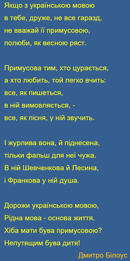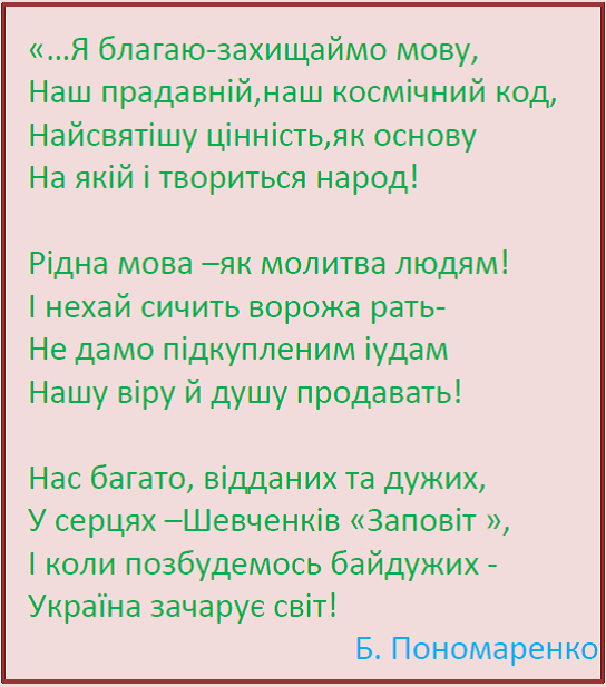 "Мова — державна перлина, Нею завжди дорожіть: Без мови немає країни — Мову, як матір, любіть"