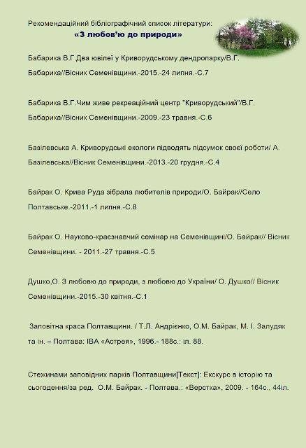 Парк, посаджений з любов’ю. Історія та сьогодення Криворудського дендропарку[Текст ]: Науково-популярне видання/ О.М.Байрак,В.Г. Бабарика, П.М.Бабарика,В.М. Самородов.-Полтава: Дивосвіт, 2016.-200с.+8с вкл.